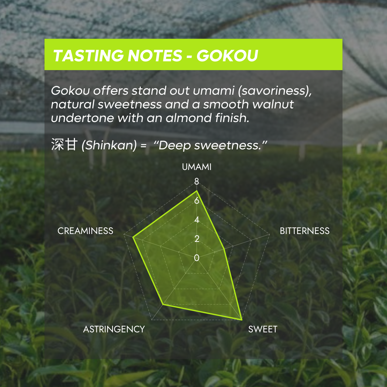 Unlike common cultivars like Samidori, Gokou is more smooth and less astringent, making it ideal for both usucha(thin tea) and atte style preparation.