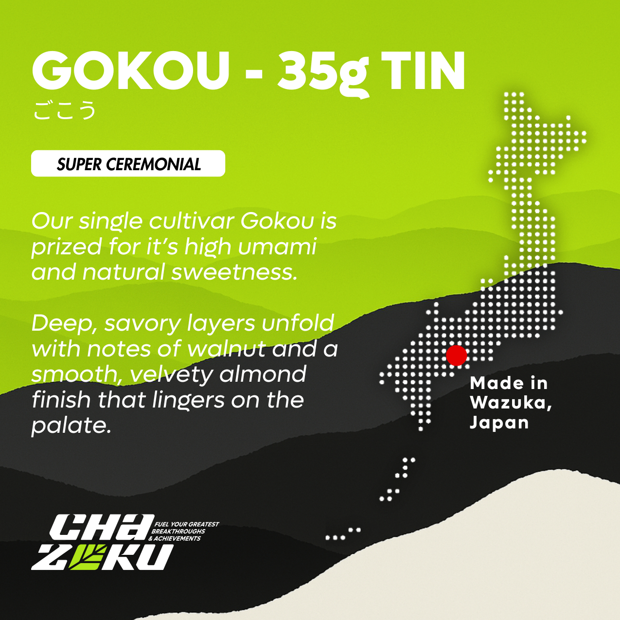 Gokou (ごこう) is a premiumzairaicultivar, prized by tea masters for its naturally high umami and mellow, full-bodied flavor. Shade grown for 25 days before harvest (ooishita saibai), it produces a deep emerald hue and a refined sweetness with minimal bitterness.