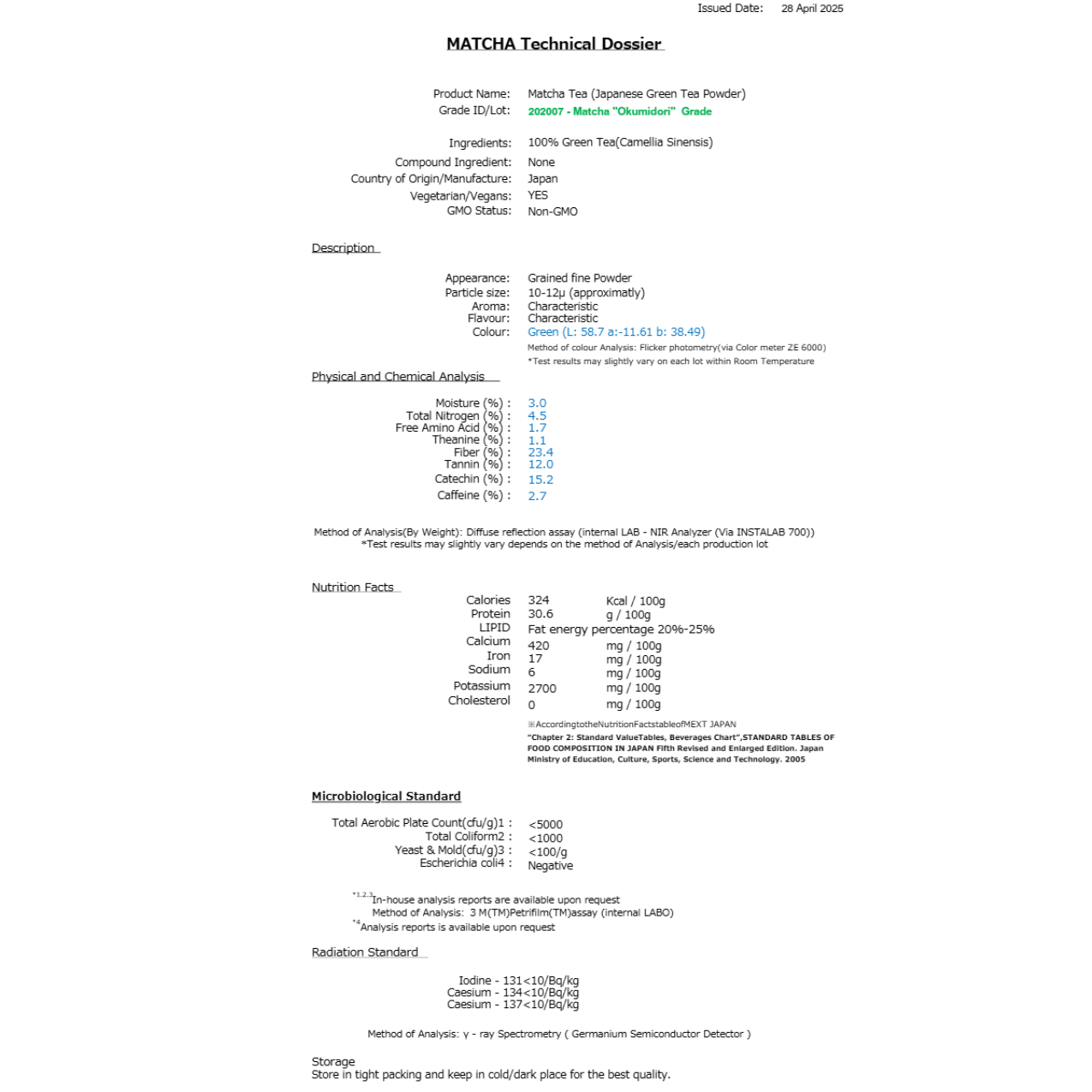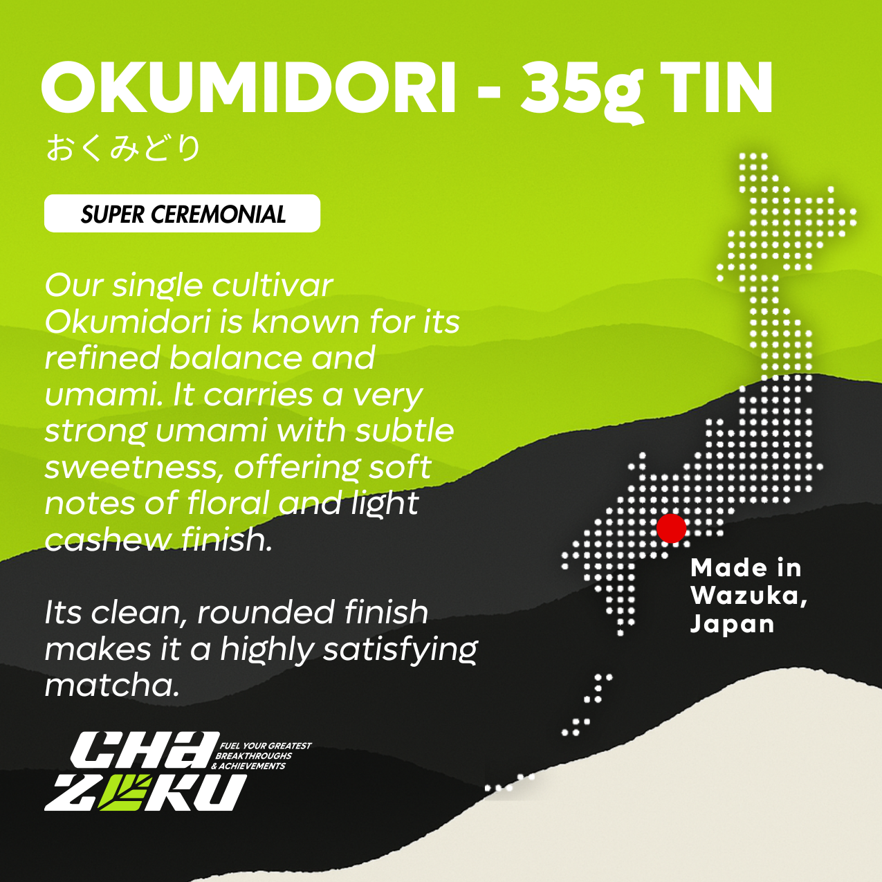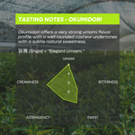 Okumidori (おくみどり) is a highly regarded cultivar known for its strong umami profile and vibrant green color. Shade grown for 24 days before harvest (ooishita saibai), it develops a smooth, mellow taste with moderate umami and gentle sweetness, complemented by a refreshing, floral and nutty aroma.