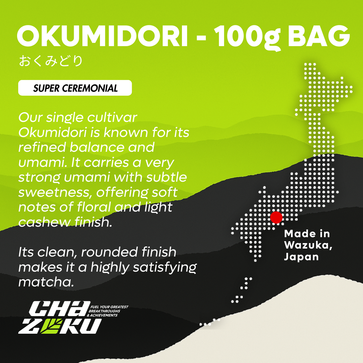 Okumidori (おくみどり) is a highly regarded cultivar known for its strong umami profile and vibrant green color. Shade grown for 24 days before harvest (ooishita saibai), it develops a smooth, mellow taste with moderate umami and gentle sweetness, complemented by a refreshing, floral and nutty aroma.